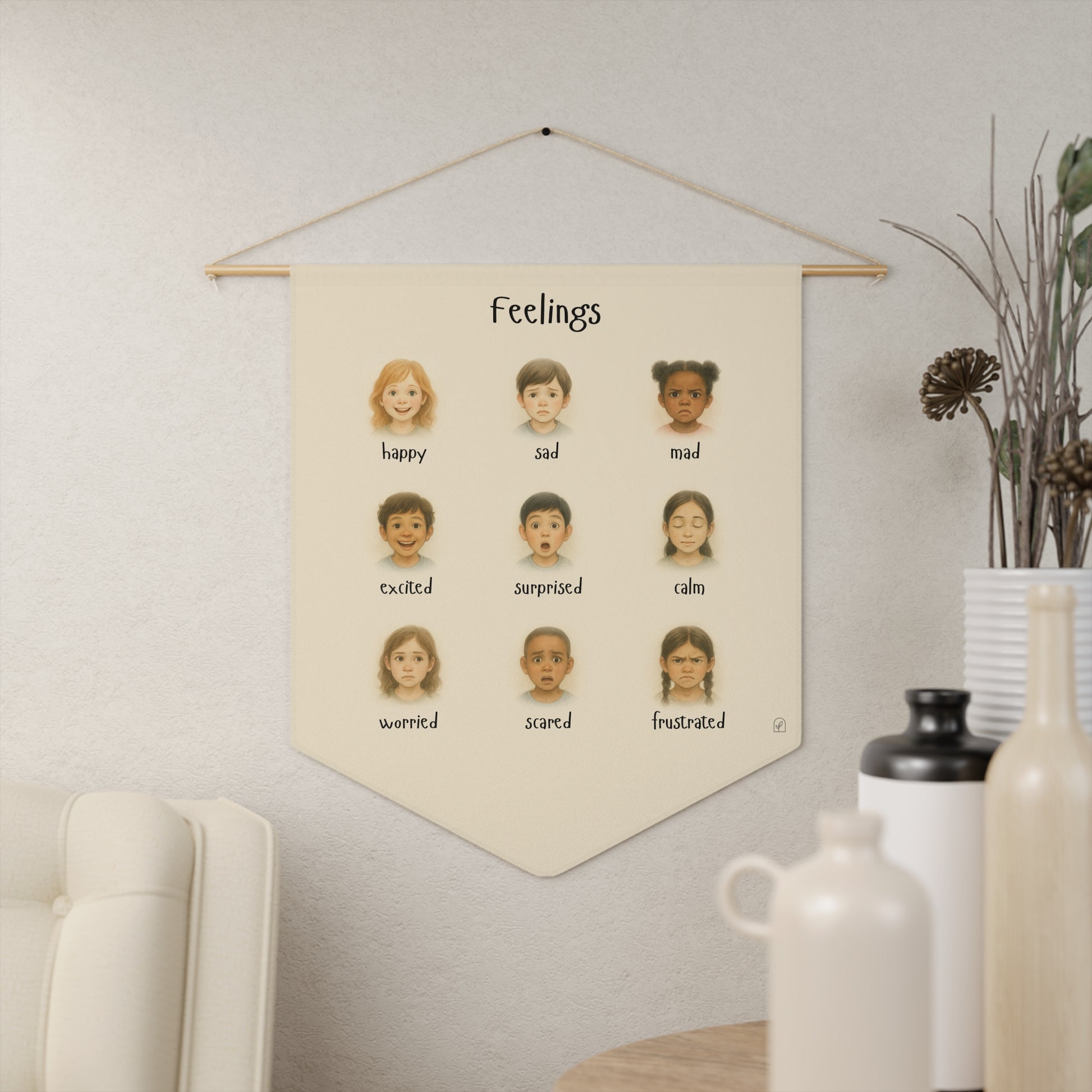 Encourage emotional growth with this soft, inviting emotions wall pennant. Featuring realistic illustrations of children's expressions, it provides a natural, gentle way for little ones to explore and name their feelings. Perfect for Montessori spaces, calm down corners, or cozy play areas, it fosters self-awareness and communication skills. A meaningful and beautiful gift for families, educators, or therapists.